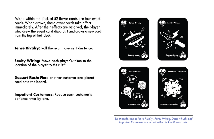 The Aliens Love Ice Cream rulebook is the result of blending game design, creative writing, and layout design to deliver an accessible and engaging guide for players. Written with the support of creative writers across BGSU's campus, every rule and mechanic was written to clearly support cooperative gameplay. The rulebook's layout design focused on clarity and flow, ensuring players can jump in with minimal confusion and easily access each page thanks to the rulebook spiral binding.