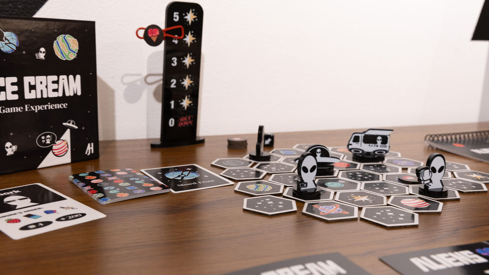 The branding of Aliens Love Ice Cream embraces a playful, space-themed aesthetic that is streamlined to match the minimalist art direction. The game includes custom cards, tokens, tiles, and player pieces, all designed for ease of use and visual clarity. Over the course of 18 months, extensive user testing was conducted across Bowling Green State University’s campus as suggestions were received to further refine the Aliens Love Ice Cream's visual design and interactive elements.