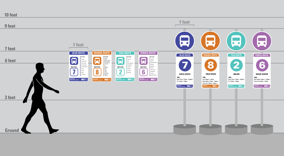 This presentation outlines the research and strategic design decisions that informed the shuttle system redesign. From simplifying the route map to designing clearly visible signage and tracker systems, each design decision was tied directly to feedback from the campus community. The presentation provides a deeper dive into how visual hierarchy, color coding, and physical scale were used to improve clarity and accessibility across the BGSU shuttle experience.