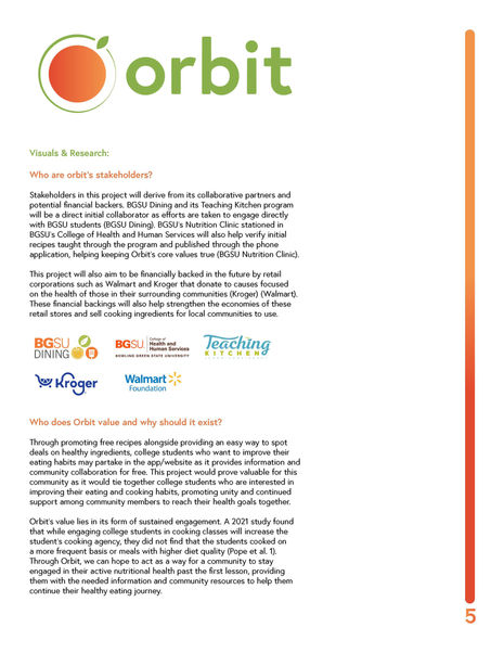 Orbit is a digital platform designed to support college students in building confidence around cooking affordable, healthy meals with locally accessible ingredients. Born out of first-hand experience and community research, the project focuses on the real-world challenges faced by students learning to live, and eat, independently. Through a minimalist mobile interface and promotional campaign, Orbit fosters connection between users by allowing them to share recipes, ingredient prices, and cooking tips specific to their area. Developed to work in collaboration with BGSU’s Teaching Kitchen and local students, Orbit aims to reduce the stress of meal planning through community-driven design. With its clean interface and warm, natural color palette, Orbit puts the spotlight on shared knowledge and local food culture, creating a digital space where community, collaboration, and nutrition orbit around each other.